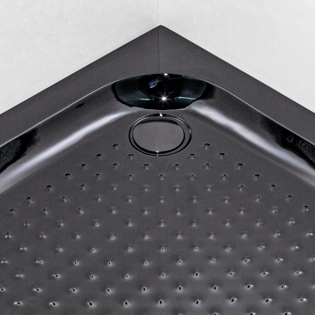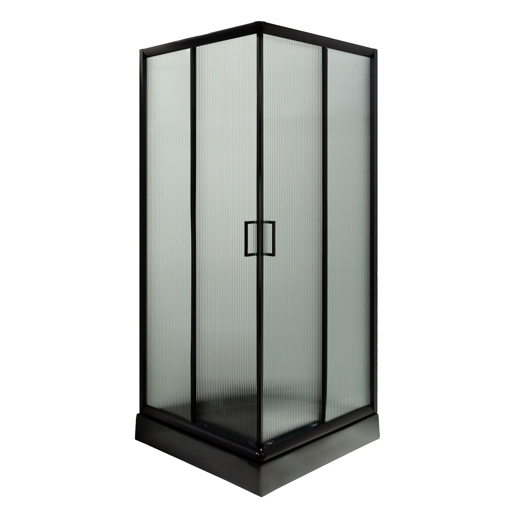 Душова кабіна із квадратним чорним піддоном. Чорний алюмінієвий профіль та дуги, чорні подвійні пластикові ручки на розсувних дверцятах.