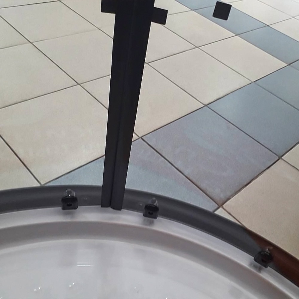 Кабіна виконана зі скла, а профіль має сатинове оздоблення. Товщина скла становить 4 мм, що гарантує його міцність та довговічність. Переднє скло кабіни виконане в прозорому-мозаїк виконанні, яке надає всьому інтер’єру вишуканості та елегантності. Колір скла ідеально поєднується з будь-яким стилем ванної кімнати.