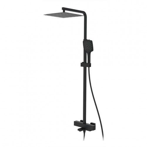 Душова система чорного кольору із латуні Gappo G2417-60. Латунь відноситься до нержавіючих металів, корпус пофарбований у чорний колір. Після нанесення фарби вона запікається в печі, це гарантує її стійкість до постійних впливів вологи. Система з термостатом допомагає позбавитися регулювань води, перепадів тиску в трубах. Контроль температури та напору відбувається завдяки термостатичному картриджу. Працює система у трьох режимах. Є окремий перемикач, але також все регулюється поворотом виливу. Система укомплектована двома видами лійок, шлангом, ексцентриками та кріпленнями.