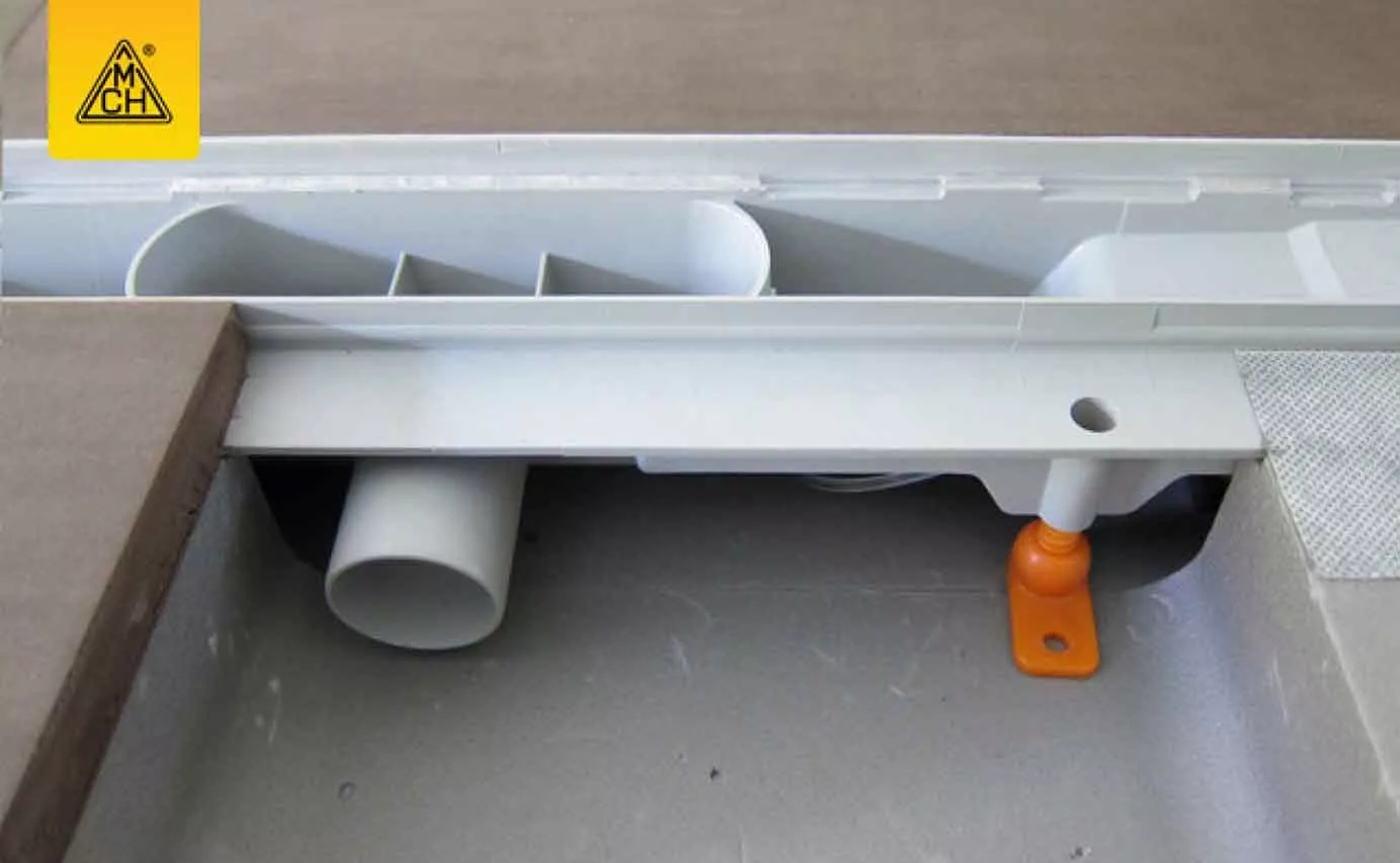 Висока пропускна здатність душових каналів МСН дозволяє застосовувати їх із будь-якими типами душових воронок. Унікальна конструкція каналів МСН забезпечує швидке та зручне встановлення, а висоту ніжок легко регулювати зверху навіть після монтажу каналу. Фланець по периметру та гідроізоляційна стрічка дозволяють зробити шар надійного захисту від попадання вологи на стяжку.