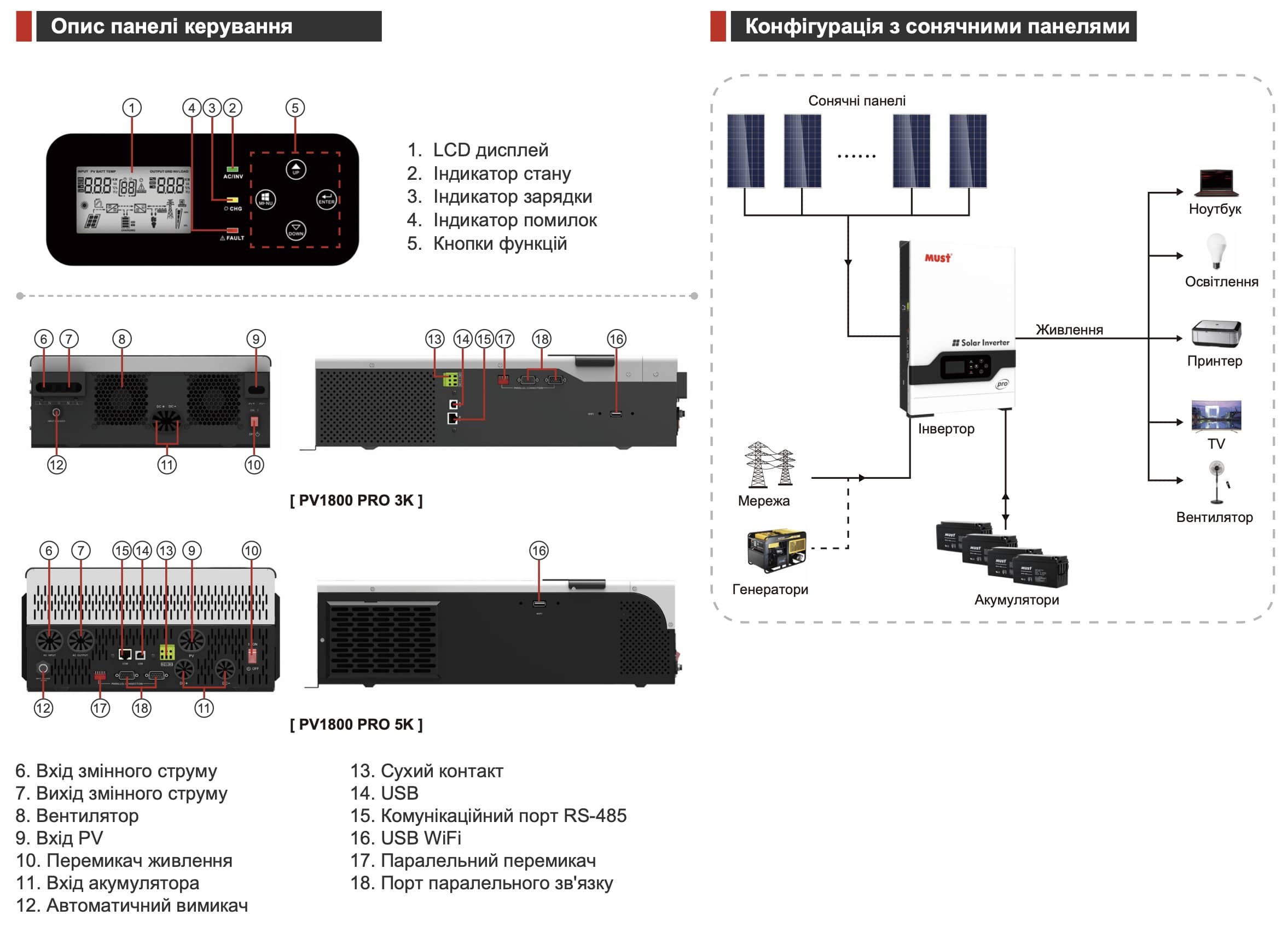- Поєднання сонячної системи, мережі змінного струму та джерела живлення від акумуляторів для безперебійного живлення