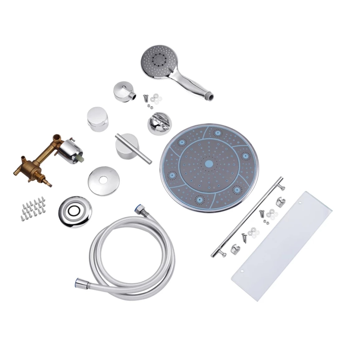 - У комплекті ручний душ із тримачем на кілька режимів, верхній душ, одноважільний змішувач