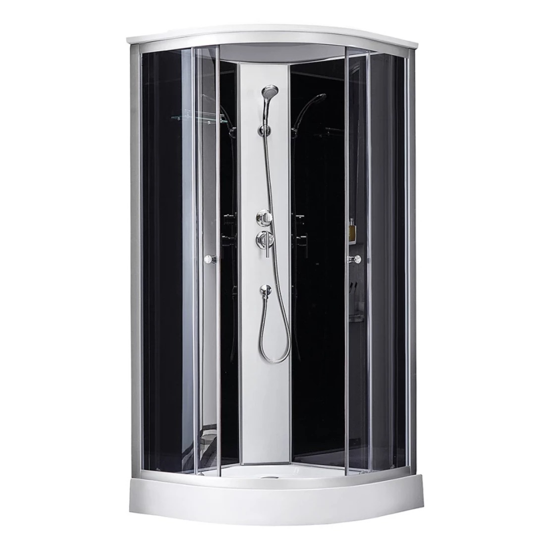 Душовий бокс Kroner KRP Enzo – SD.C.F.G. 90×90 см CV029572 стане чудовим рішенням для компактних приміщень завдяки своїй заокругленій формі та максимальному наповненню. Гідробокс складається з дрібного душового піддону з рельєфною протиковзкою поверхнею. На акриловий піддон встановлена кабінка з чорними задніми стінками, розсувними дверима з тонованого скла і ідахомі з вентиляційними отворами.