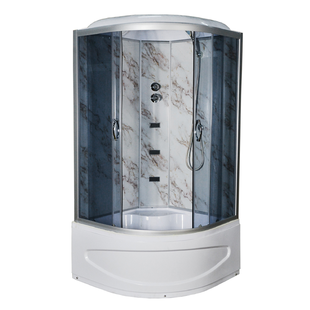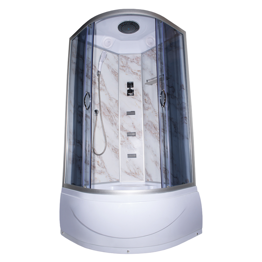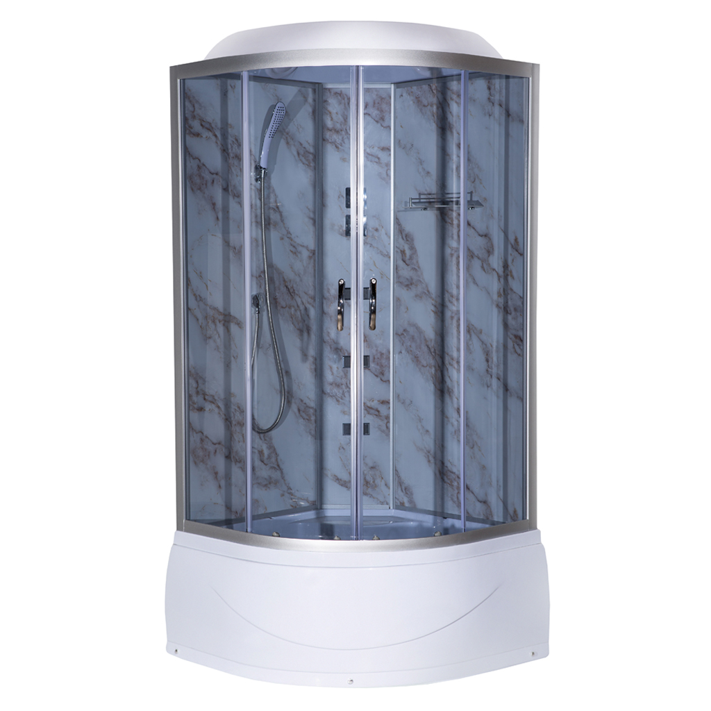 Бічні стінки та розсувні дверцята з тонованого скла товщиною 4 мм. Задні стінки та центральна панель виготовлені з декоративного акрилового склопластику з візерунком “мармур”. Центральна панель обладнана гідромасажними форсунками. На декорованому даху боксу встановлений верхній тропічний душ.