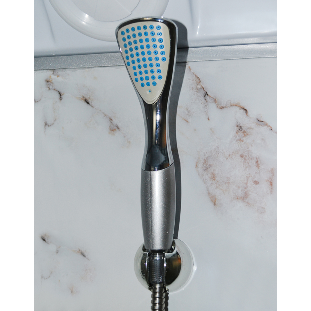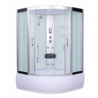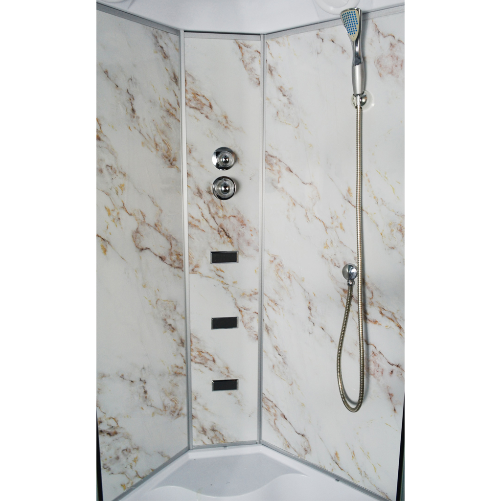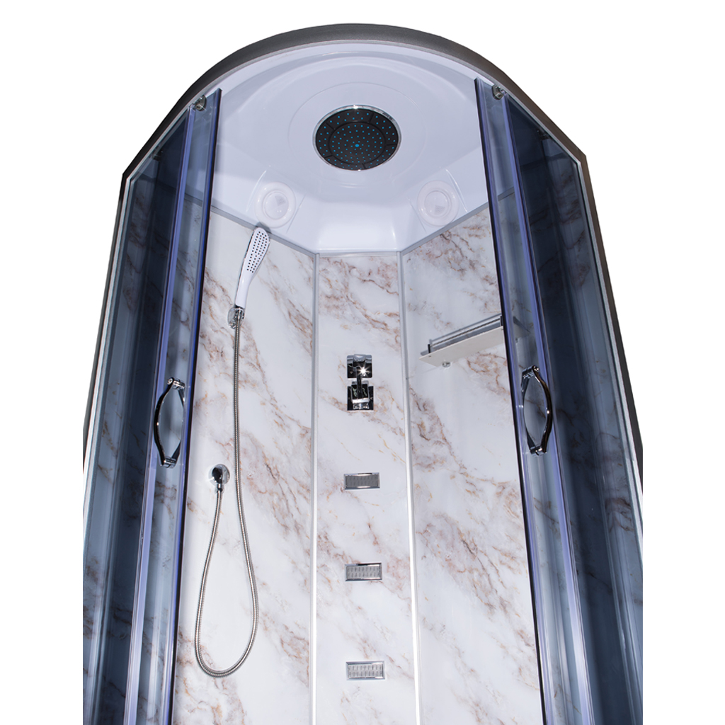 Бічні стінки та розсувні дверцята з тонованого скла товщиною 4 мм. Задні стінки та центральна панель виготовлені з декоративного акрилового склопластику з візерунком “мармур”. Центральна панель обладнана гідромасажними форсунками. На декорованому даху боксу встановлений верхній тропічний душ.