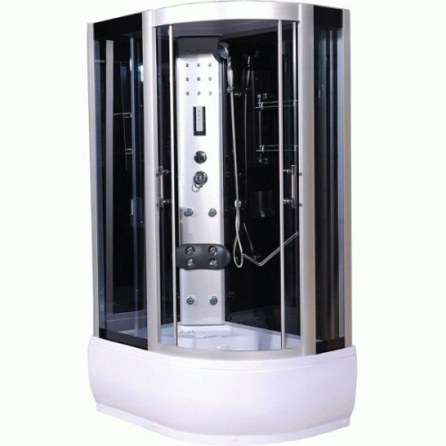 Гідромасажний бокс AquaStream Comfort 128 HB L, форма – асиметрична, ліва, розмір – 120х85 см, висота кабіни – 220 см, переднє скло – сіре, задні стінки – скло чорне, комплектація – профіль алюмінієвий сатин ширина 8 см, алюмінієва гідромаса скло, товщина 5 мм, переднє/бокове скло, товщина 5 мм, акриловий піддон, монолітне сидіння, сенсорна панель управління, радіо, витяжний вентилятор, динамік, гідромасаж 8 форсунок, подушка для спини, верхній душ з led підсвічуванням, ручний душ, гідромасажна панель з led підсвічуванням, металеві ручки, подвійні сталеві ролики, дзеркало, поличка, подвійний дозатор мила, масажер ніг, багатофункціональний змішувач, сифон старт/стоп, країна виробник – Китай.