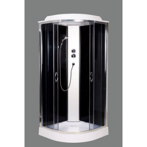 Гідромасажний бокс AquaStream GLS 90 Black Low, форма – напівкругла, розмір – 90х90 см, висота – 215 см, переднє скло – сіре, комплектація – профіль алюмінієвий сатин, алюмінієва панель, заднє скло, переднє/бокове скло, акриловий піддон, верхній душ, ручний душ, ручки хром, поличка, багатофункціональний змішувач, сифон старт/стоп, країна виробник – Китай.