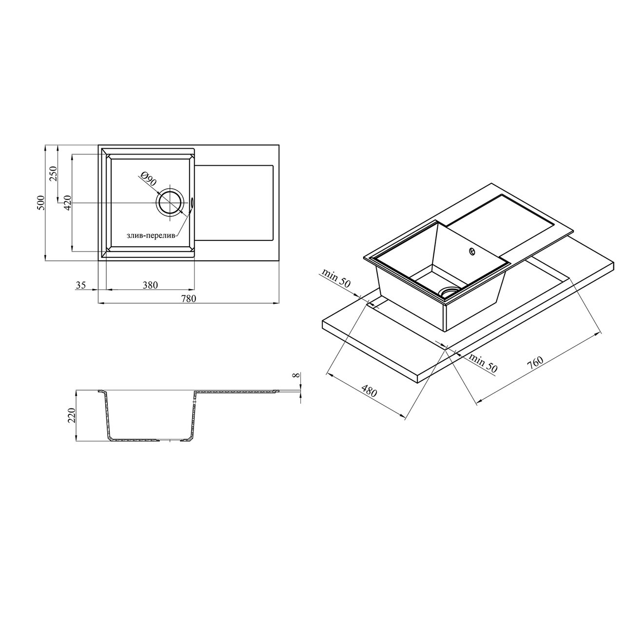 - розміри миття (ШхГхВ): 780 х 500 х 220 мм