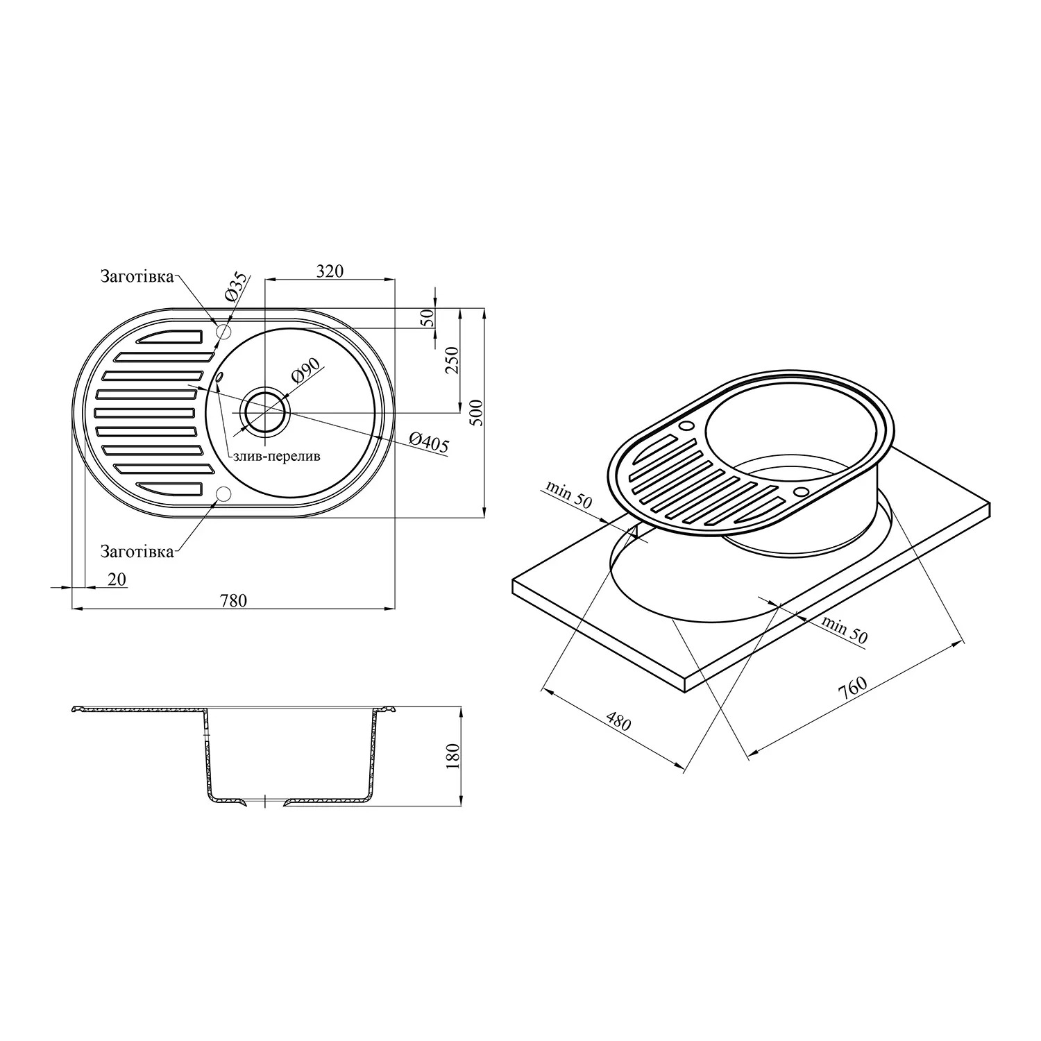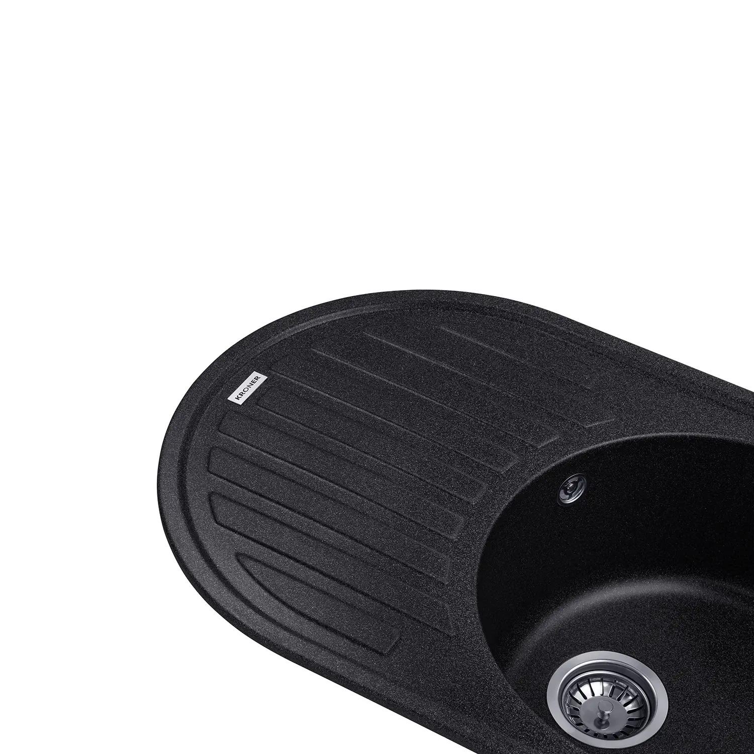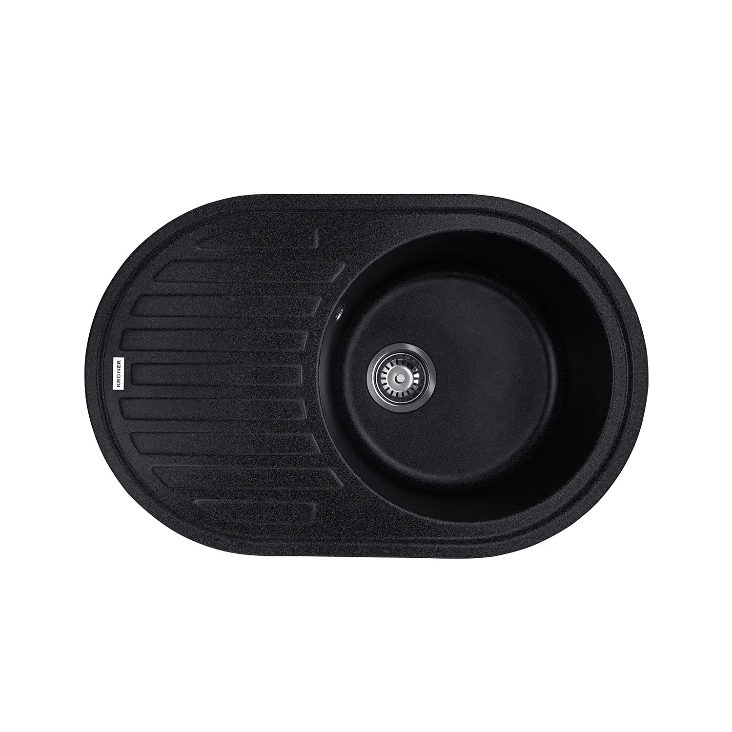 Овальна композитна мийка Kroner в графітовому кольорі має круглу чашу і крило для сушіння посуду зі спеціальними заглибленнями. Крило можна розмістити як праворуч, так і ліворуч, мийка обертається. Глибока чаша мийки дозволяє з легкістю мити габаритний посуд або набирати воду у вази для квітів. Мийка встановлюється врізним способом на стільницю і фіксується за допомогою кріплень, що входять до комплекту постачання. На борту мийки є один отвір для змішувача. Також мийка укомплектована сифоном з переливом та кошиковим зливом.