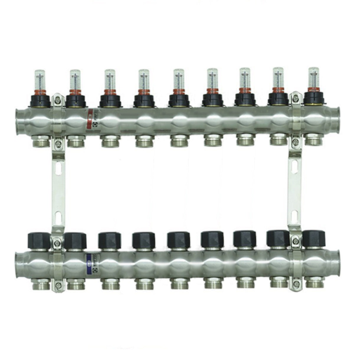 Колектор призначений для розподілу потоку теплоносія систем водяного опалення до окремих (споживачів) нагрівальних приладів або групи приладів, контуру теплої підлоги, окремої гілки системи опалення. Перевагою використання колектора є компактність, а можливість регулювання дозволяє уникнути перепадів тиску споживачів. Колектор виготовлений із нержавіючої сталі. На виходах прямого колектора встановлено настроювальні клапани з витратомірами, зворотний колектор оснащений термостатичними клапанами (ручні,, З можливістю обладнання сервоприводами). З’єднання всіх елементів блоку між собою виконано на гумових кільцях ущільнювачів, що дозволяє відмовитися від використання додаткових ущільнювальних матеріалів. У блоці використовується трубна циліндрична різьба класу “А”, що відповідає стандартам (ISO228/2.ISO 7/2). Приєднання трубопроводів до виходів здійснюється за допомогою фітингів 3/4″ за стандартом “Євроконус”. Блок так само укомплектований заглушками та здвоєними кріпильними кронштейнами.
