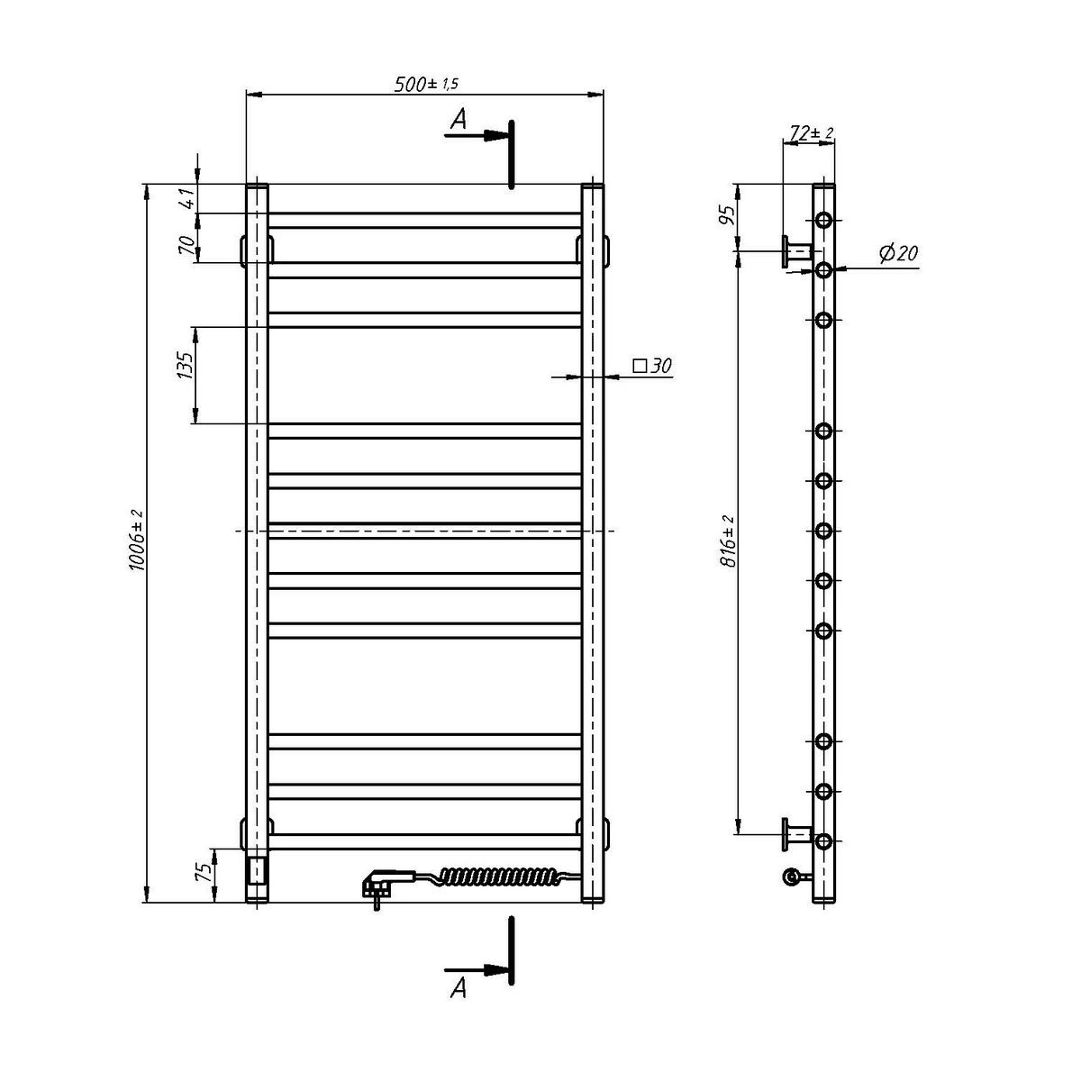 Сушка для рушників Класік Квадро 500х1000 Sensor (колір і чорний; розташування шнура з вилкою і праворуч) від українського виробника NAVIN виготовлений з вуглецевої сталі, яка відрізняється високою якістю і міцністю. Модель має надійне порошкове покриття. Товщина стінок бічних колекторів (стійок) та перемичок сушарки становить 1,5 мм.