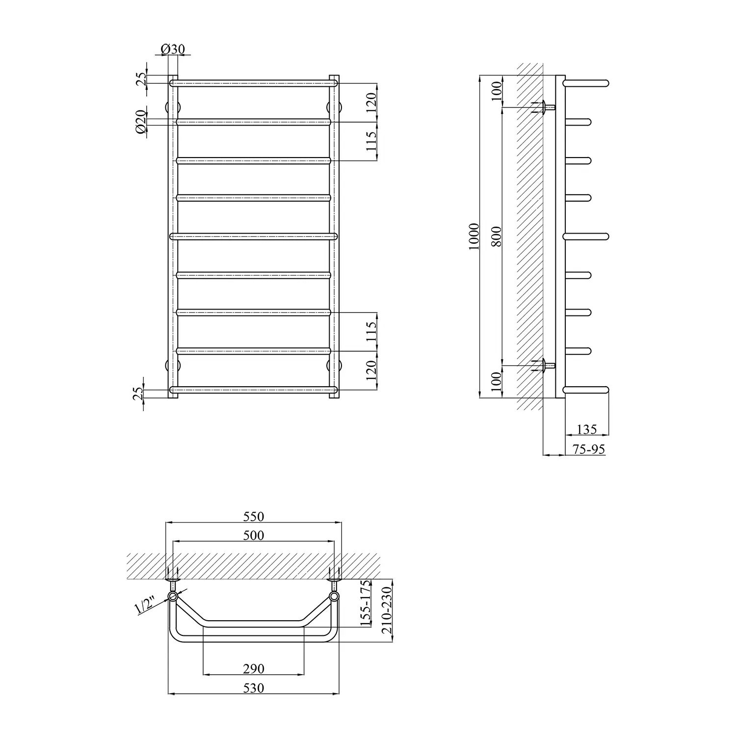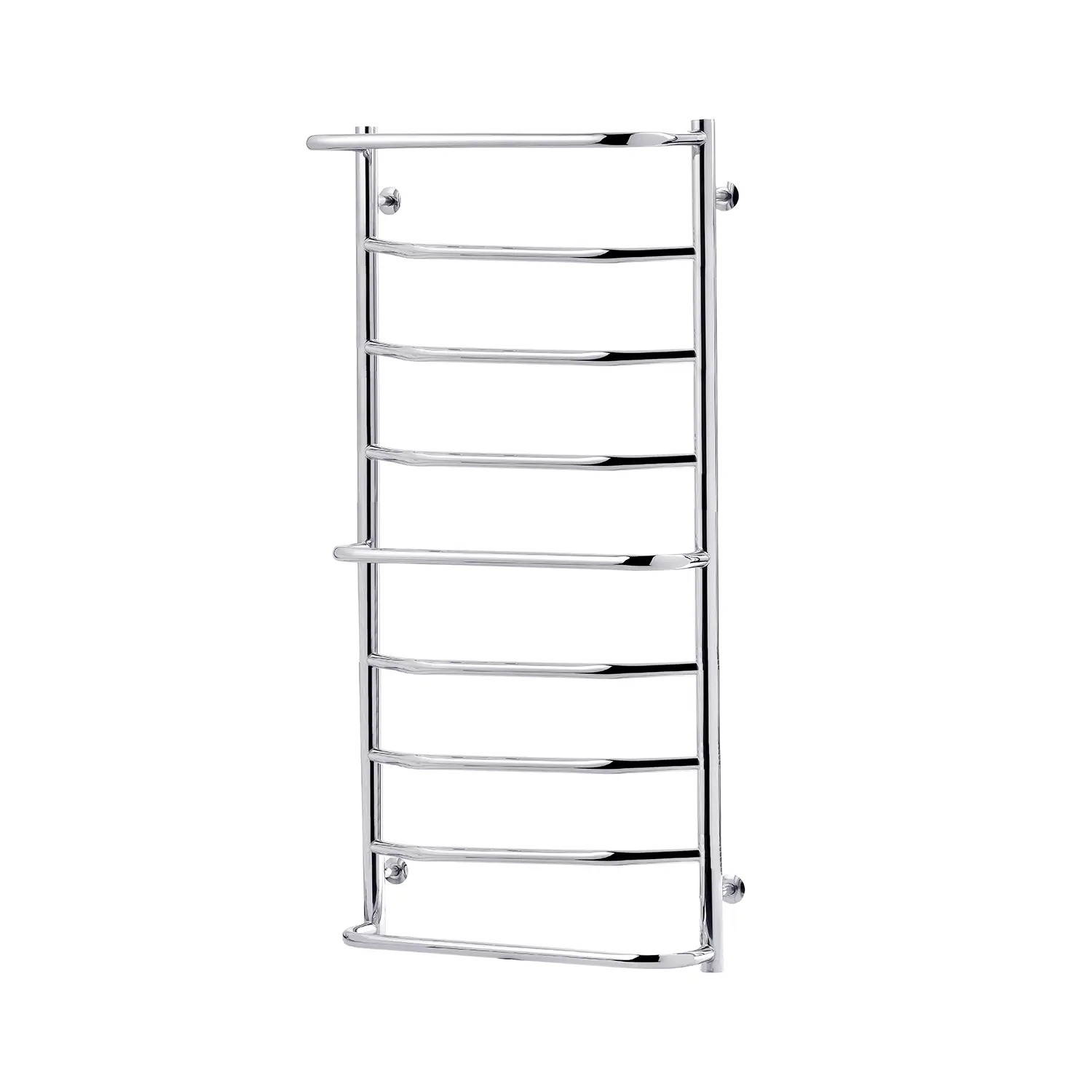 Водяний сушка для рушників Kroner виготовлена з харчової нержавіючої сталі SUS301 і має хромоване покриття. Сушка для рушників виконана у формі драбинки з скобоподібними перемичками різного розміру, які чергуються більша – менша. У комплект поставки входить сам сушарка для рушників, набір кріплень до стіни, кран Маєвського і заглушки. Таким чином ви можете підключити сушарку для рушників в будь-якій комбінації (бічної, нижньої або діагональної) до системи гарячого водопостачання для роботи цілий рік з гарантією 10 років або до системи опалення – для роботи в опалювальний період, з гарантією 3 роки.