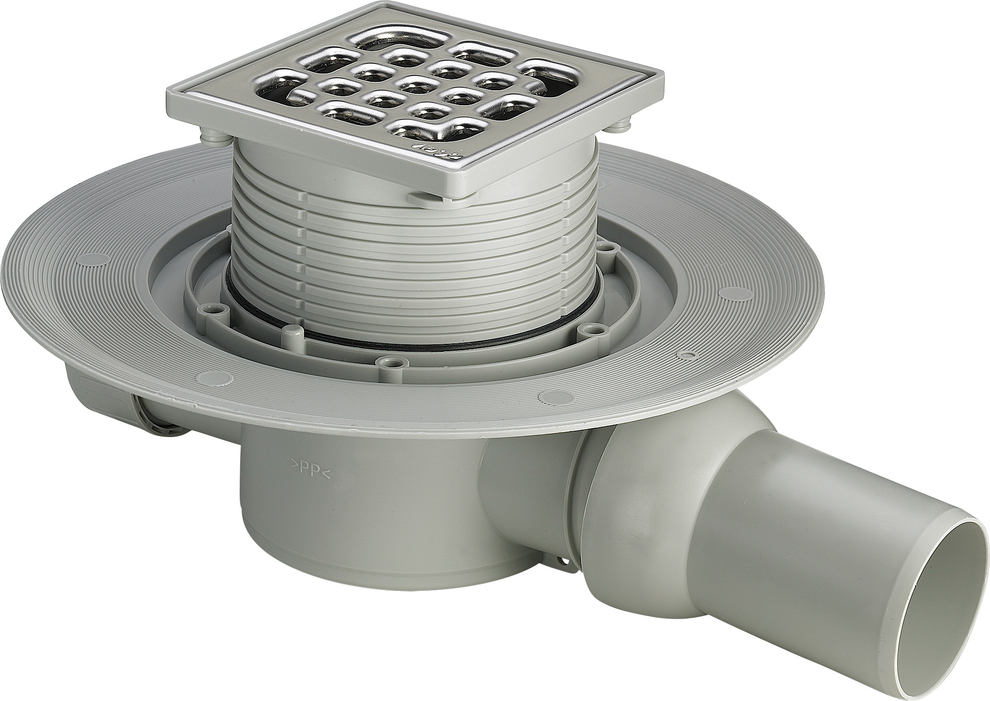 Трап для ванної кімнати, висота стовпа рідини в гідрозатворі 30 мм, клас навантаження K=300 кг, в комплектацію входить: поворотна і регульована по висоті насадка 100×100 мм, рамка для встановлення решітки зроблена з пластику, заглушка, штампована решітка1,4 фланець для нанесення/закріплення гідроізоляції, пристрій для захисту від неприємного запаху з системи каналізації, введення для підключення додаткових сантехприладів DN40, випуск на шарнірному з’єднанні