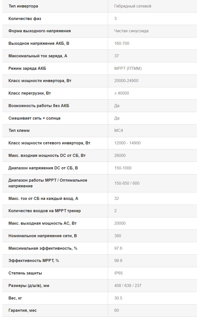 Дозвольте представити вам високотехнологічний пристрій DEYE і гібридний інвертор DEYE SUN-20K-SG01HP3-EU-AM2. Це інноваційне рішення розроблене з урахуванням передових технологій у сфері енергетики. інвертор забезпечує поєднання потужності, ефективності та надійності, ідеально підходячи для досвідчених користувачів. Примітно, що під час запуску DEYE SUN-20K-SG01HP3-EU-AM2 демонструє свої ключові переваги. Початкова напруга сонячних панелей становить 180 V, забезпечуючи швидке та стабільне підключення. У комплекті з інвертором постачається різноманітне обладнання, включаючи інструкцію, трансформатори струму, комунікаційний кабель, роз’єм для акумулятора і навіть Wi-Fi модуль для сучасного управління. Маючи номінальну потужність 20000 W та пікову потужність 30000 W, гібридний інвертор легко справляється з різноманітними навантаженнями. Спектр вхідної напруги (170-280 V) та форма вихідної напруги і синусоїда і забезпечують ефективне перетворення енергії та стабільність постачання електроенергії. DEYE SUN-20K-SG01HP3-EU-AM2 оснащений 3 фазами для більш рівномірного розподілу енергії. ККД інвертора становить 97,6%, наголошуючи на його ефективності при використанні сонячної енергії. Максимальний струм заряду становить 37 A, забезпечуючи ефективне керування підключеними пристроями. Додатковою перевагою є можливість паралельного підключення, що дозволяє розширити спектр енергетичної системи. Діапазон роботи контролера MPPT (150 і 850 V) забезпечує інтеграцію сонячних панелей різних типів. При фокусі професійного використання важливим чинником є іінадійність. інвертор має захист IP65 від пилу та вологи. Робочий діапазон температур від -40 до +60 ° C гарантує надійну роботу в різноманітних кліматичних умовах. DEYE SUN-20K-SG01HP3-EU-AM2 також надає додаткові опції, такі як 100% небалансований вихід по кожній фазі, інтеграція зі змінним струмом для модернізації сонячної системи, можливість підключення генератора та WiFi-логер для моніторингу та керування в будь-якій точці світу.