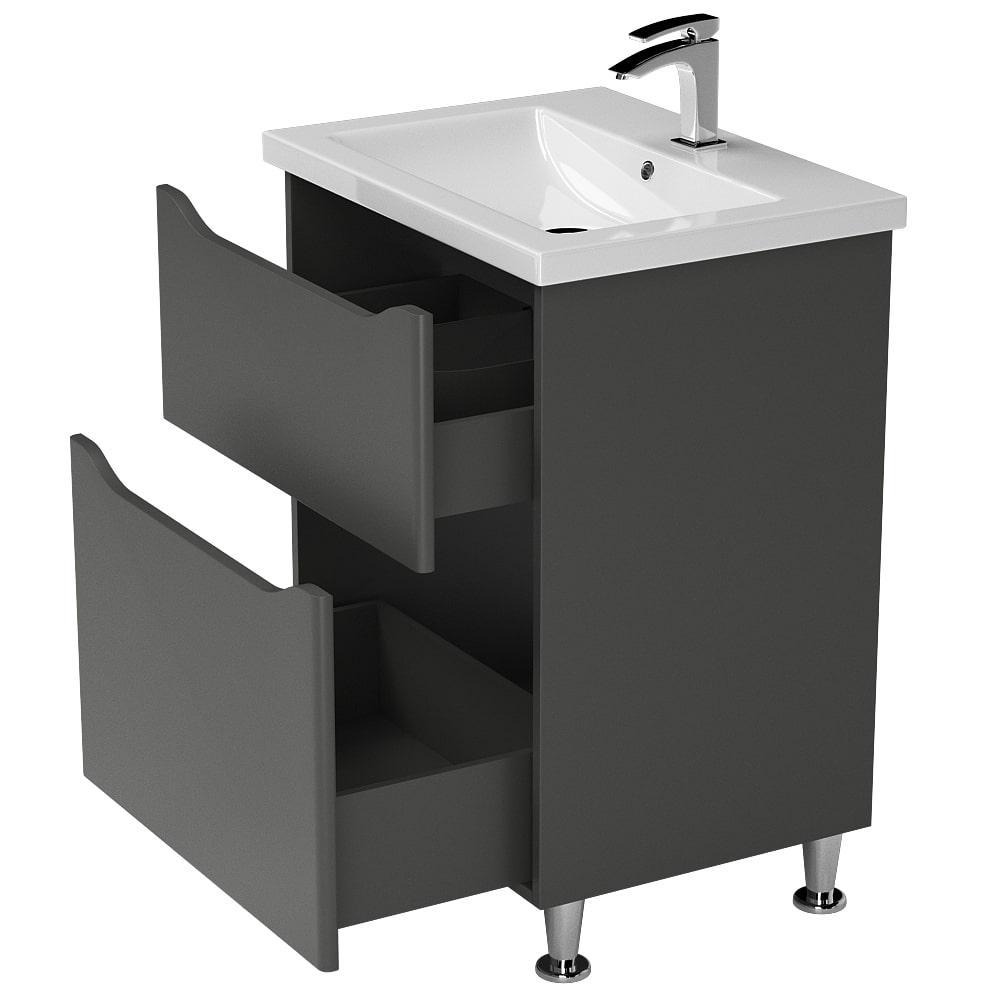 Підлогова, пристінна тумба Савойя від Aquarius має габаритні розміри 56 х 80 х 44 см (Ш х В х Г), і оснащується двома висувними ящиками з внутрішнім простором для зберігання різної побутової хімії та дрібниць. Модель поставляється разом із раковиною зі штучного каменю Комо шириною 60 см. Раковина має отвір для монтажу змішувача та переливний отвір. Модель поставляється без змішувача з ніжками.