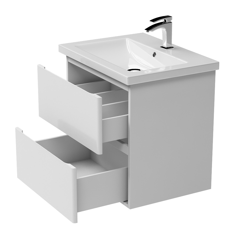 Підвісна, пристінна тумба Teffi від Aquarius має габаритні розміри 56 х 56 х 44 см (Ш х В х Г), та оснащується двома висувними ящиками з внутрішнім простором для зберігання різної побутової хімії та господарських дрібниць. Модель поставляється разом із раковиною зі штучного каменю Plaza шириною 55 см. Раковина має отвір для монтажу змішувача та переливний отвір. Модель поставляється без змішувача.