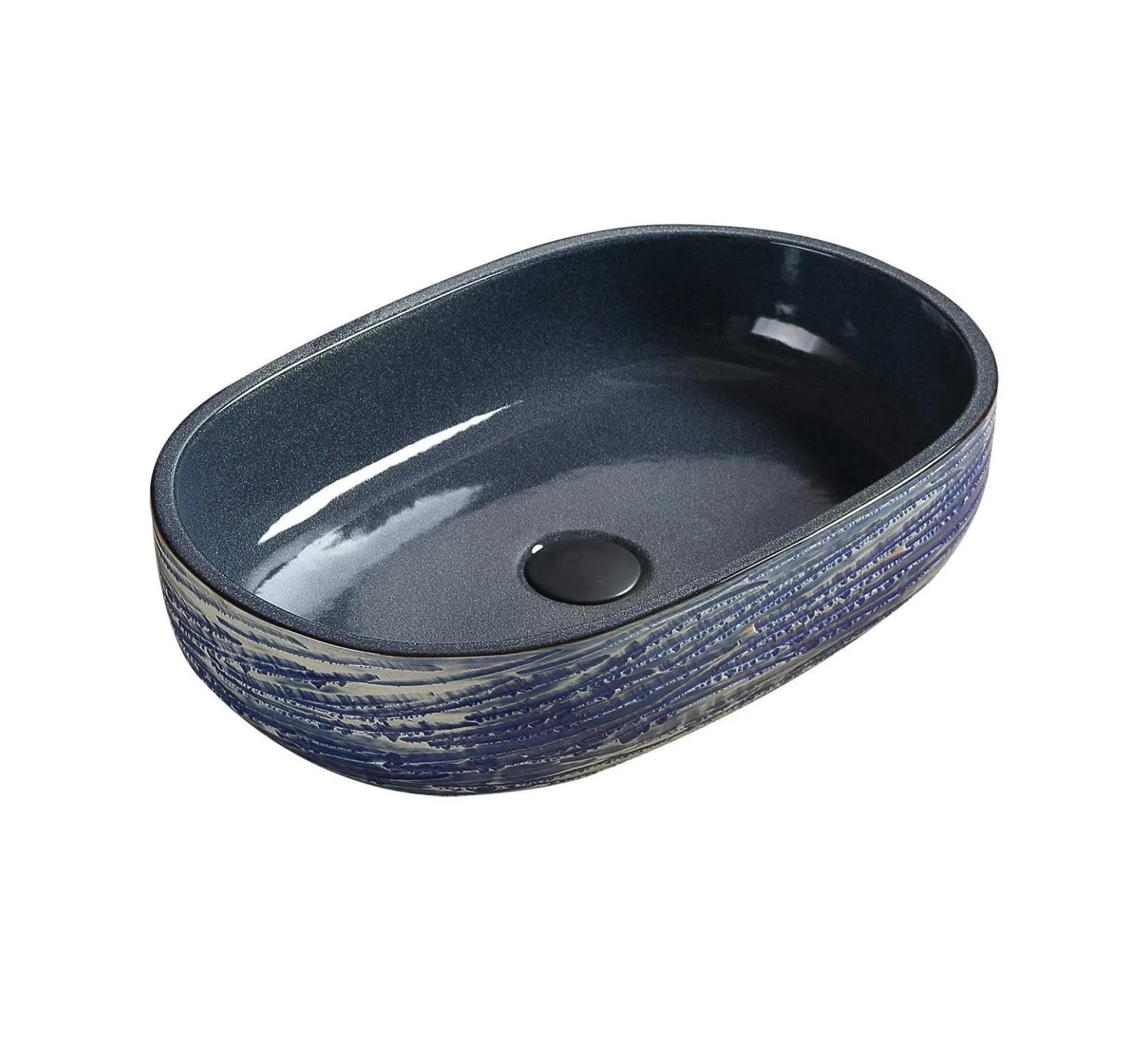 Дуже незвичайний накладний синій глянсовий умивальник, який має сучасний вигляд та високу функціональність.
