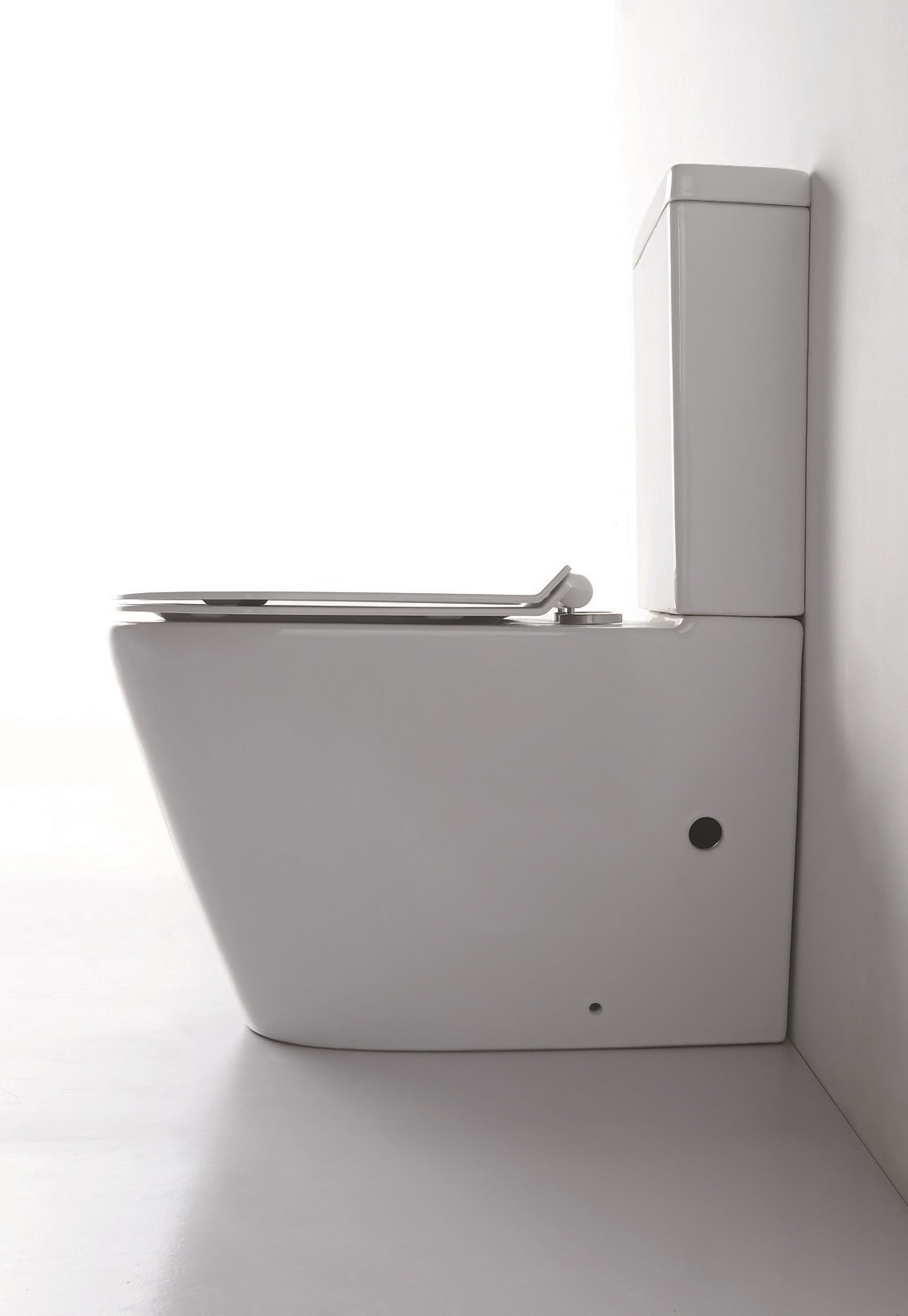 Підлоговий унітаз DUSEL є безободковою чашею з горизонтальним зливом, поставляється в комплекті з швидкознімним дюропластовим сидінням Soft Close, бачком з нижнім підведенням води і установчим комплектом.