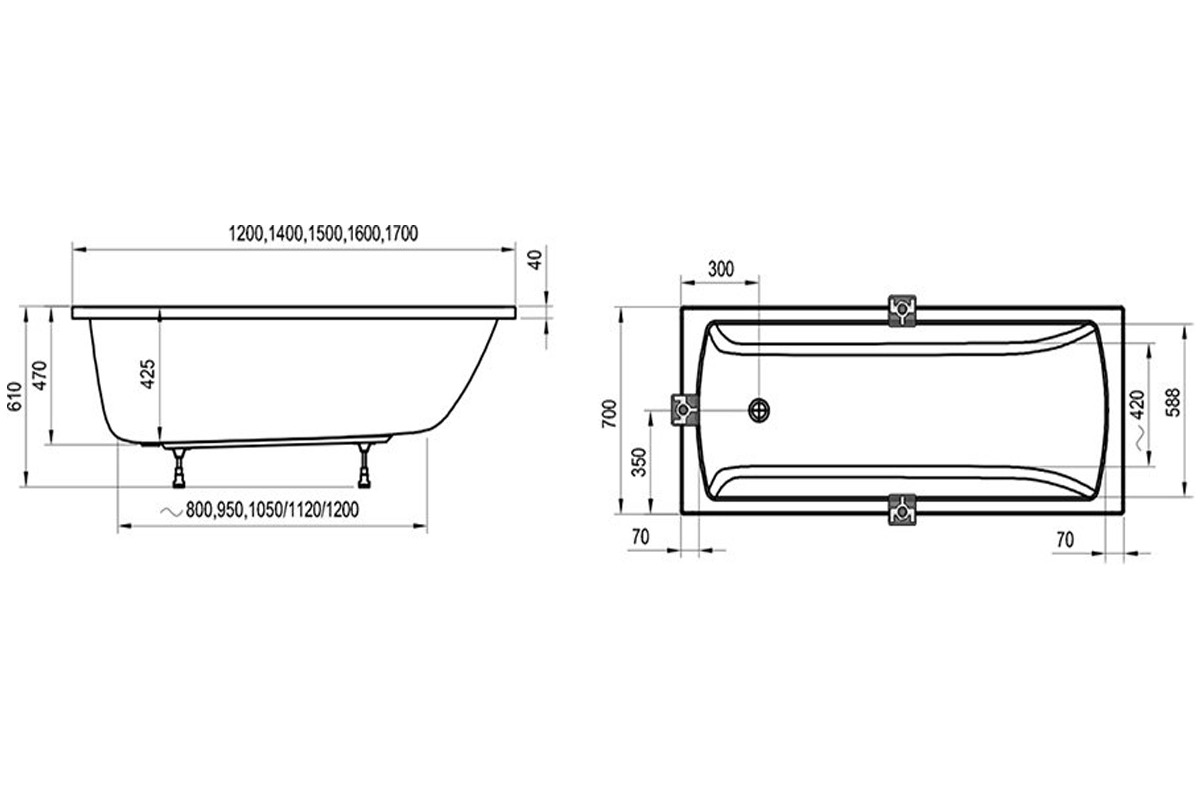 Тонкі легкі обідки і більший нахил боків надають ванні надзвичайно великого внутрішнього простору, навіть з урахуванням його розмірів. Купання та прийом душа сприяє безпечне плоске дно і кілька варіантів шторок або дверей для ванної.