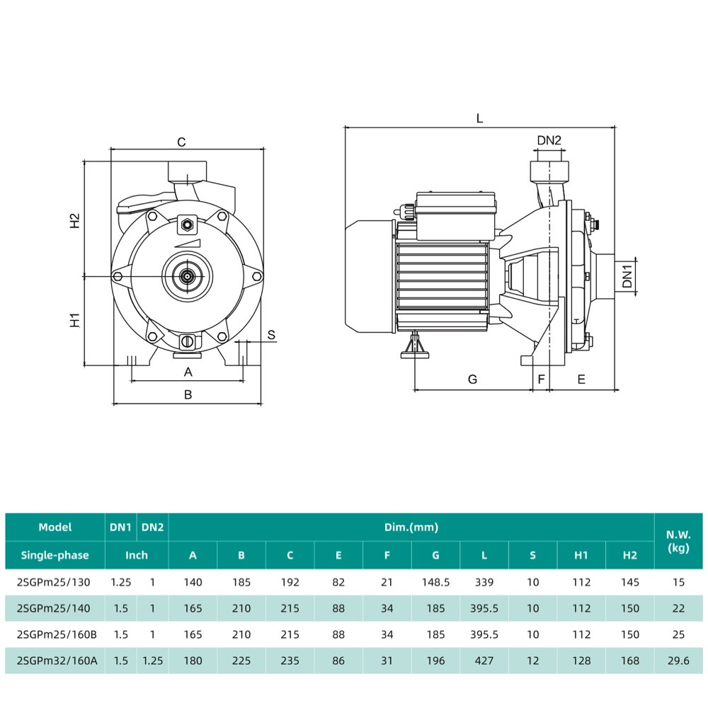 Відцентровий насос з двома робочими колесами закритого типу, мідна обмотка з класом ізоляції “F” і багаторазовим термозапобіжником, комбінований вал, частина, що взаємодіє з водою, виконана з нержавіючої сталі марки AISI-304, насосна частина виконана з чавуну і має антикорозійне покриття, максимальна висота. 8м, комплектується кабелем 1.3 м та вилкою європейського зразка, гідравлічне підключення: DN1=1і”, DN1=1і”.