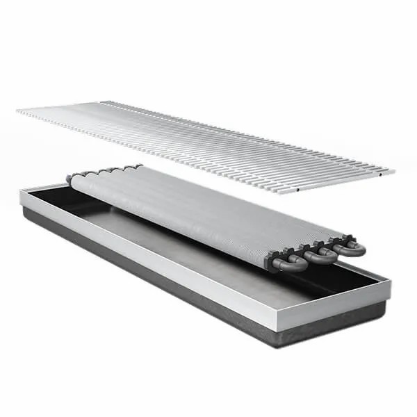 – Гаряча вода подається до конвектора, проходить через теплообмінник, а повітря, що нагрівається від нього, піднімається вгору, створюючи теплову завісу вздовж вікна.