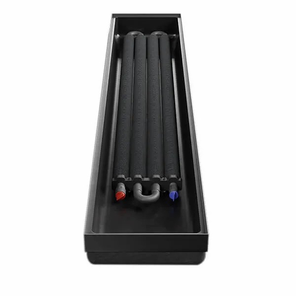 – Гаряча вода подається до конвектора, проходить через теплообмінник, а повітря, що нагрівається від нього, піднімається вгору, створюючи теплову завісу вздовж вікна.