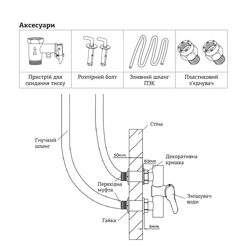 Комплектація – Пристрій для скидання тиску, розпірний болт, зливний шланг ПЗК, пластиковий з’єднувач, гарантійний талон, інструкція з експлуатації