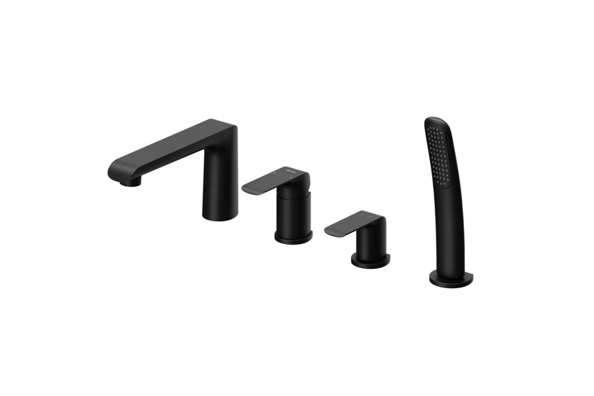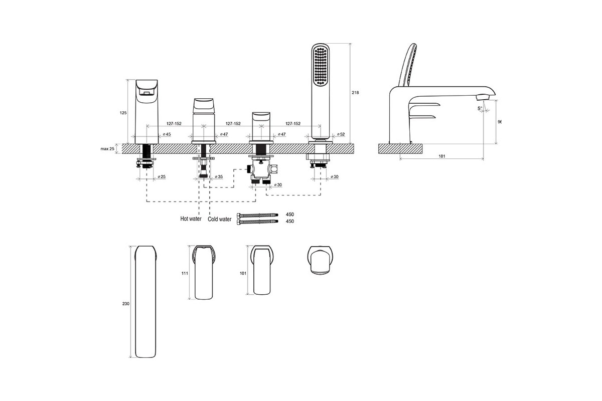 Врізний змішувач на чотири отвори підходить для встановлення на борт ванни. У комплекті зі змішувачем поставляється висувний душ із металевим шлангом, довжиною 175 см із шарніром з одного боку.